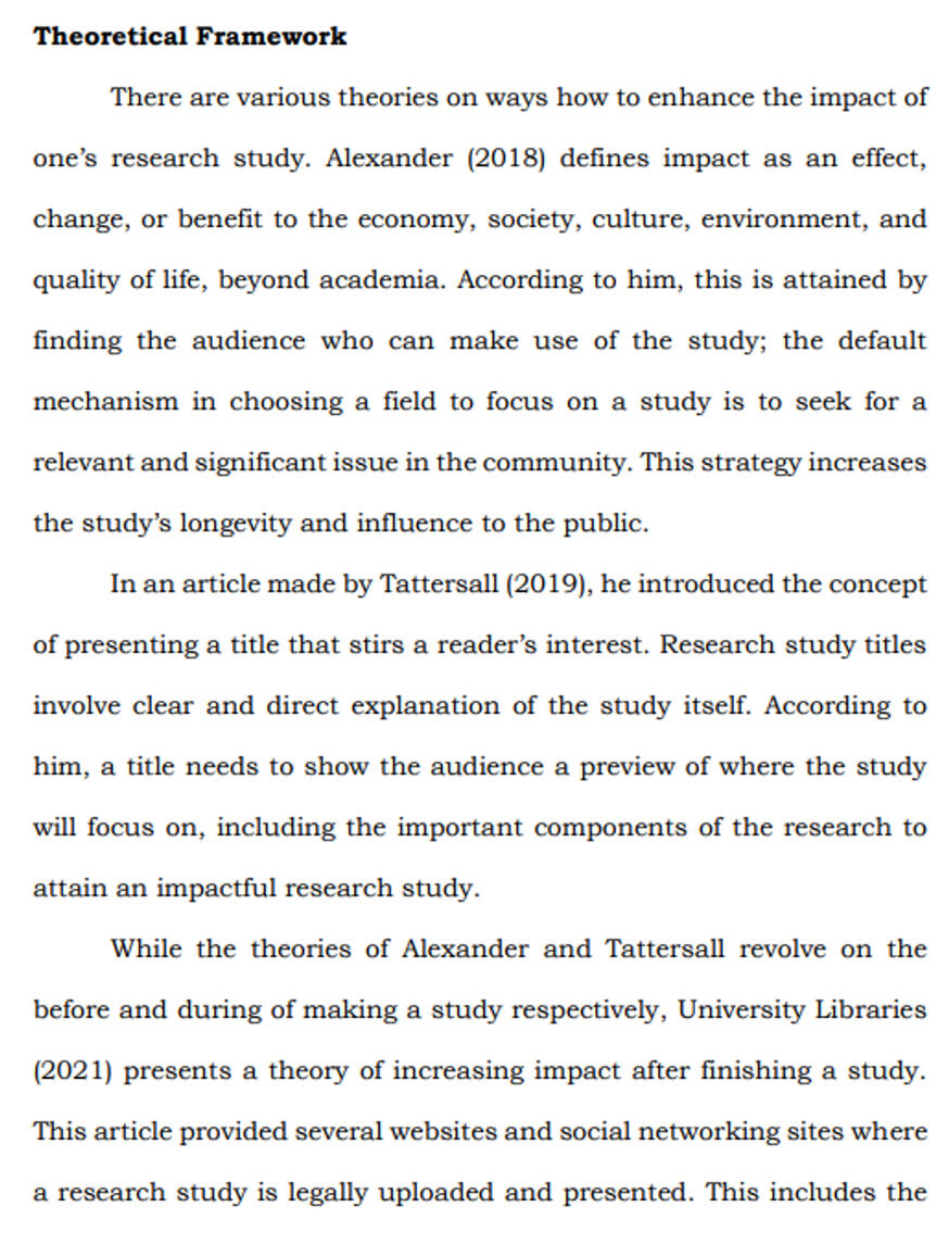 The theoretical framework must demonstrate an understanding of theories and concepts that are relevant to the topic of your research paper and that will relate it to the broader fields of knowledge in the class you are taking.